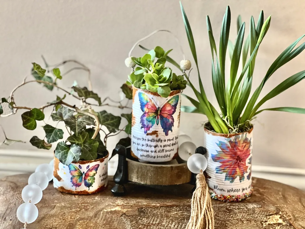 Tin cans from beans, tomatoes, or coffee make excellent rustic planters. They are sturdy and ideal for both indoor and outdoor gardening.